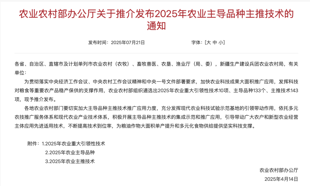 2025年4月,农业农村部推介发布2025年农业主导品种和主推技术。由全国畜牧总站推荐,广西扬翔集团股份有限公司、华中农业大学联合多家省级畜牧技术推广机构协同开展的“生猪全链条数字智能育种装备技术”,成功入选2025年十大农业重大引领性技术。