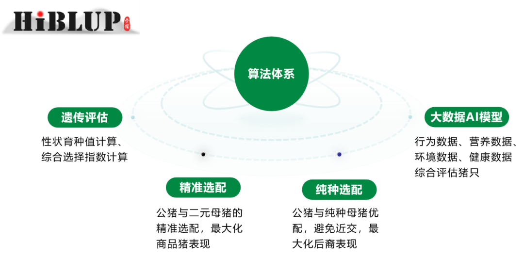 基于收集到的各世代猪全生命周期的数据,利用大模型算法对猪只进行精准遗传评估,提高育种效率,采用精准选配算法,匹配最优的公猪与二元母猪进行配种,最大化个体杂种优势,降低商品猪的料肉比。