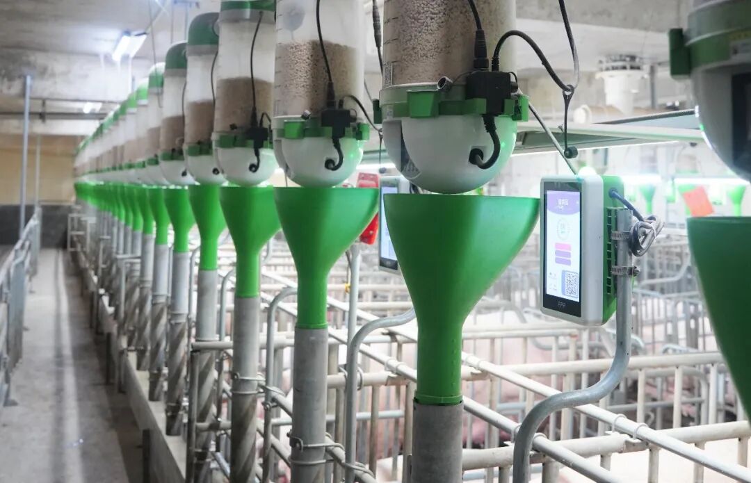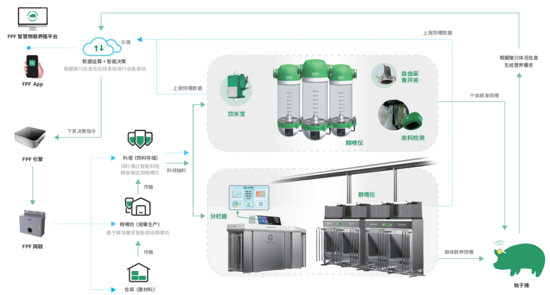 利用在线近红外、原料码、料塔称重器、群喂仪、精喂仪、测温仪等智能设备,实现饲料生产和养猪生产场景数字化,实时收集饲料原料、成品、猪场生猪各生长阶段的品种、营养、生理、健康、环境等数据,结合传统的多种统计学模型和机器学习,对猪的营养需要和供给做精准评估,提升养殖中饲料利用效率。
