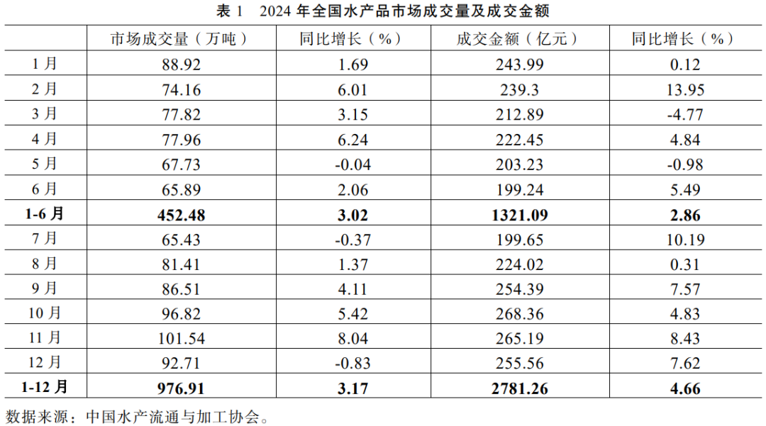 2024年全年水产品市场成交活跃。上半年水产品市场价格持续低迷,为降低存塘风险,养殖户积极出塘。据对可比的45家批发市场统计,上半年水产品市场成交量452.48万吨、成交额1321.09亿元,分别增长3.02%、2.86%(见表1)。下半年水产品消费需求有所恢复,水产品市场价格出现回升。受市场需求端拉动和回笼资金等因素影响,养殖户积极出塘,水产品市场成交量额持续增长。2024年,全国水产品市场成交量976.91万吨、成交额2781.26亿元,分别增长3.17%、4.66%。
