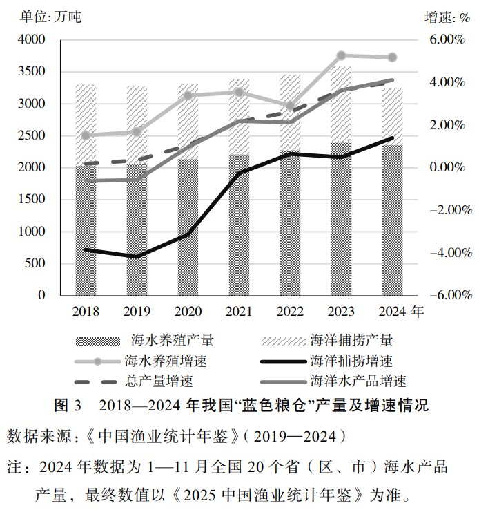2023年4月,习近平总书记在广东省视察时指出,“解决好吃饭问题、保障粮食安全,要树立大食物观,既向陆地要食物,也向海洋要食物,耕海牧渔,建设海上牧场、‘蓝色粮仓’”。2024年,沿海省份坚持创新引领、装备先行、控近推远、生态发展的理念,积极拓展现代海洋牧场空间,科学布局深水网箱、围栏式养殖场和桁架类大型养殖装备,深远海养殖渔场发展迅猛。截至2024年9月底,广东省建成重力式深水网箱5616口、桁架类网箱11个;福建省改造传统网箱100万口、贝藻类筏式养殖设施4.7万公顷,建成重力式深水网箱5000口、深远海养殖装备19台套;山东省建成重力式深水网箱2200口,深远海养殖装备达25台套;浙江省建成重力式深水网箱2076口、桁架类网箱3个、管桩式大型围栏39座。另外,沿海省份积极实施“互联网+设施渔业”行动,加强养殖装备技术创新集成,发展智慧高效渔业,加快形成海上养殖生产集群。海水养殖在水产品稳产保供和渔业转型发展中作用日渐凸显。2024年1—11月,全国20个省(区、市)海水产品产量3250.05万吨,增长4.12%,其中,海水养殖产量2356.08万吨,增长5.19%;海洋捕捞产量893.98万吨,增长1.40%。海水养殖产量增速不仅超过海水产品增速,更在所有类别的水产品产量增速中位居第一,成为名副其实的水产品产量增长引擎(图3)。