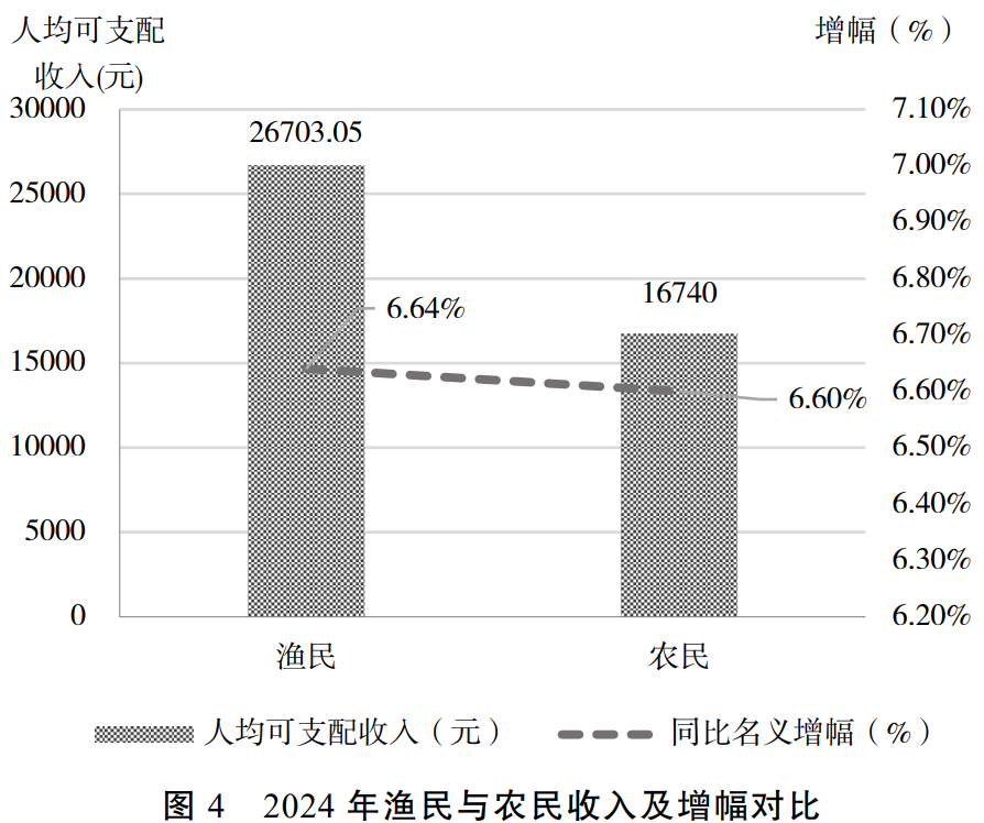 2024年水产品综合价格24.88元/千克,下跌2.43%,其中海水产品44.84元/千克,保持持续下跌态势,跌幅达4.67%;海水甲壳类、藻类、鱼类分别下跌9.43%、6.70%、3.80%,仅海水贝类上涨1.40%。这主要是因为海水养殖产量较快增长,直接拉低海水产品价格。加之海水产品消费更多依赖高端餐饮,消费降级也拉低了海水产品价格。另外,进口高档价廉水产品对海水产品价格产生了一定的冲击。2023—2024年,水产饲料价格下降在一定程度上缓解了养殖生产压力,但是水产品市场价格的持续低迷严重制约了渔民增收。据全国渔民家庭收支调查,对剔除异值后的9242户样本户调查数据进行加权计算,全年渔民人均纯收入为27131元,名义增长5.25%,增幅比“十四五”初期(2021年)下降了2.1个百分点;全年渔民人均可支配收入为26703.05元,名义增长6.64%,与前三季度农民人均可支配收入名义增幅相比,仅高0.04个百分点(图4)。