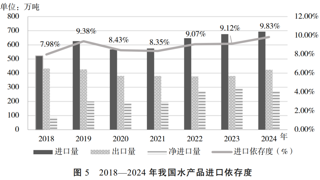 我国水产品贸易面临的挑战之一是进口依存度的不断提升。2018—2024年,我国水产品进口依存度不断攀升,反映了我国水产品对外部市场的依赖程度逐步加深(图5)。2024年,我国水产品净进口量269.28万吨,对外依存度已上升至9.83%。特别是对虾进口依赖程度居高不下,进口价走低冲击国内市场价格。2022年起,我国超过美国成为世界上对虾最大进口国。2022年、2023年对虾一般贸易进口量分别是87.60万吨、99.35万吨,分别增长44.04%、13.40%,占国内对虾总供给的比重分别是24.44%、25.71 %。2024年,对虾进口量有所下降,为92.54万吨,下降6.84%,但仍然占据国内对虾供给的四分之一左右。此外,近三年对虾进口价格不断走低,2022年、2023年及2024年1—8月对虾进口均价分别为6.51美元/千克,5.46美元/千克,4.84美元/千克,对国内虾价造成一定的冲击。